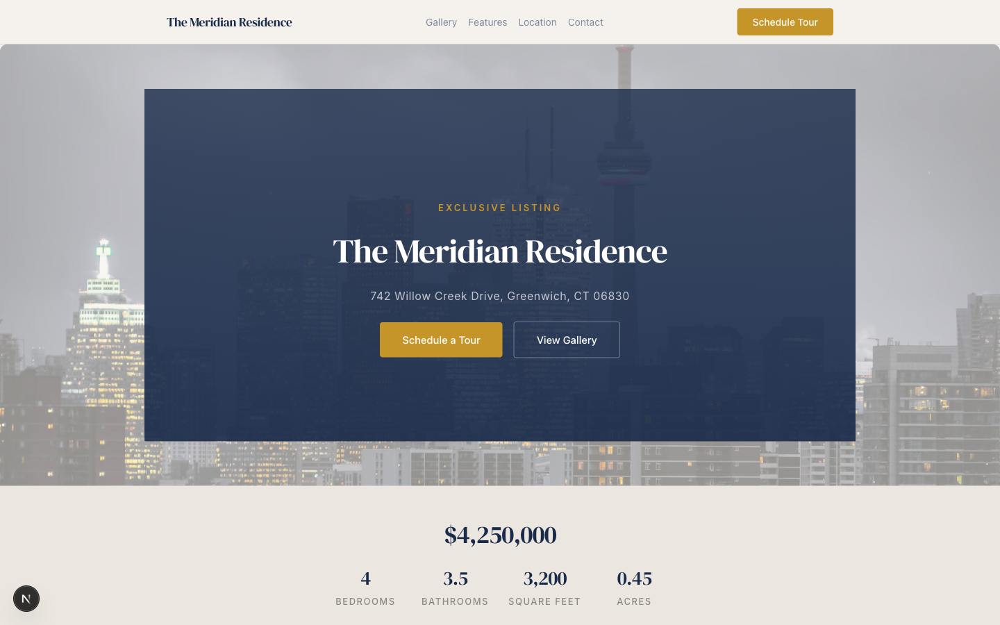 A refined property listing page with full-bleed hero gallery, detailed specs, amenity grid, photo gallery, neighborhood info, and agent contact — designed for luxury real estate.
