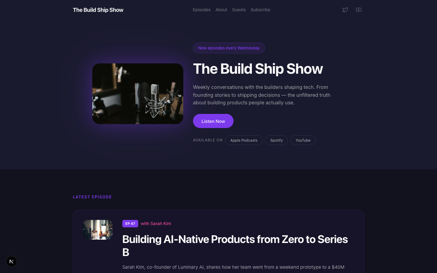 A bold podcast and creator page with dark charcoal tones, electric purple accents, episode listings, guest spotlights, and platform subscription links — designed for shows that want to look as good as they sound.
