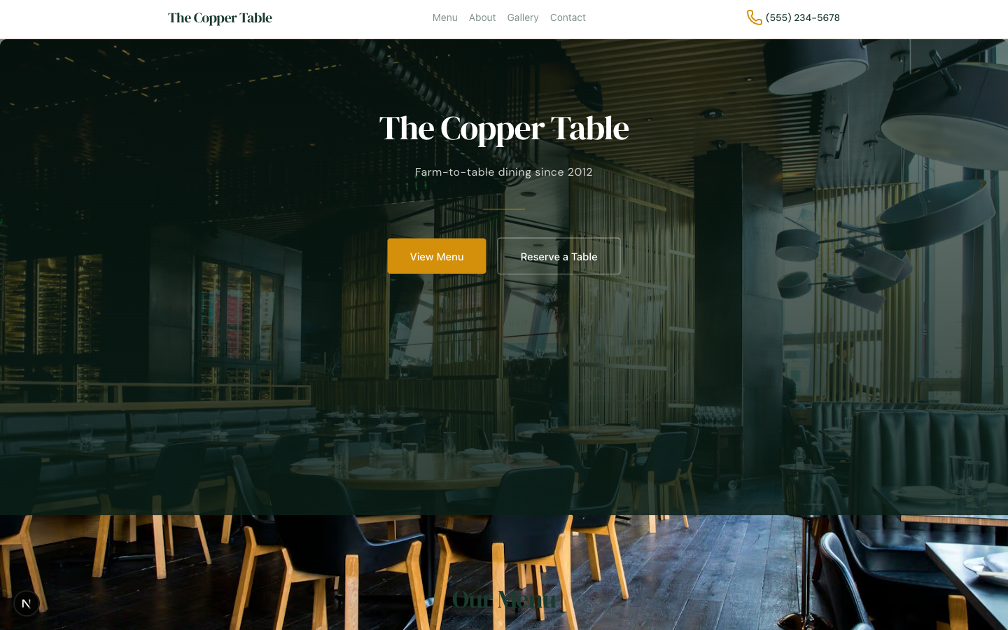 A warm, elegant service-business template for restaurants, cafés, salons, and local shops — featuring a menu/price-list layout, gallery, reviews, and hours & location cards.